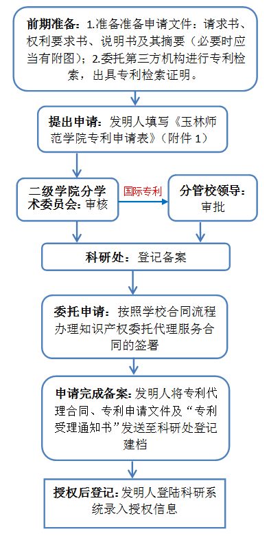 2、发明人填写《玉林师范学院专利申请表》(附件1),经所在二级学院分学术委员会审核、分学术委员会签字、二级学院盖章(若申请国际专利则还需分管校领导审批)后,将申请表和第三方机构出具的检索证明原件一并报科研处登记备案。