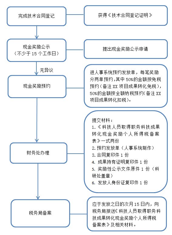10.财务发放现金奖励。项目负责人需持合同复印件、成果持有证明复印件、奖励性公示文件原件(科研处盖章)、发放人身份证复印件及预约发放单,若满足个税减半的还需填写《科技人员取得职务科技成果转化现金奖励个人所得税备案表》(附件5)签字盖章后一并交到财务处,并依法履行相关备案手续。