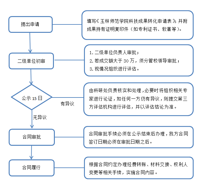 2.提出申请、二级单位初审。成果完成人填写《玉林师范学院科技成果转移转化申请表》(附件1),并附成果持有证明复印件(如专利证书、软著等)及相关材料,存在关联关系的需要提交利益关联书面声明,经所在二级单位初审。