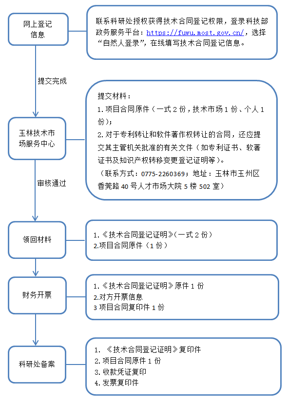 7.技术合同免税登记(可选)。合同签订完毕后,需办理技术合同登记的请联系科研处覃杏柳老师,科研处协助项目负责人办理技术合同登记。待取得《技术合同登记证明》后再向校财务申请开取免税发票,若未办理登记和未予登记的,开票产生的税费则由项目负责人或受让方承担。